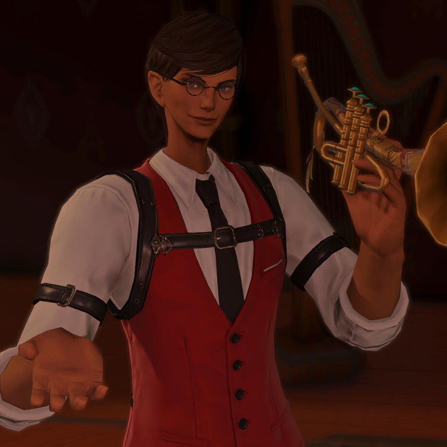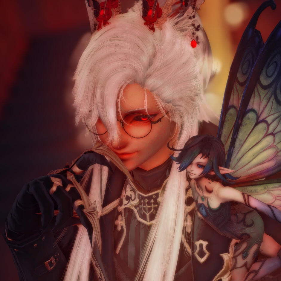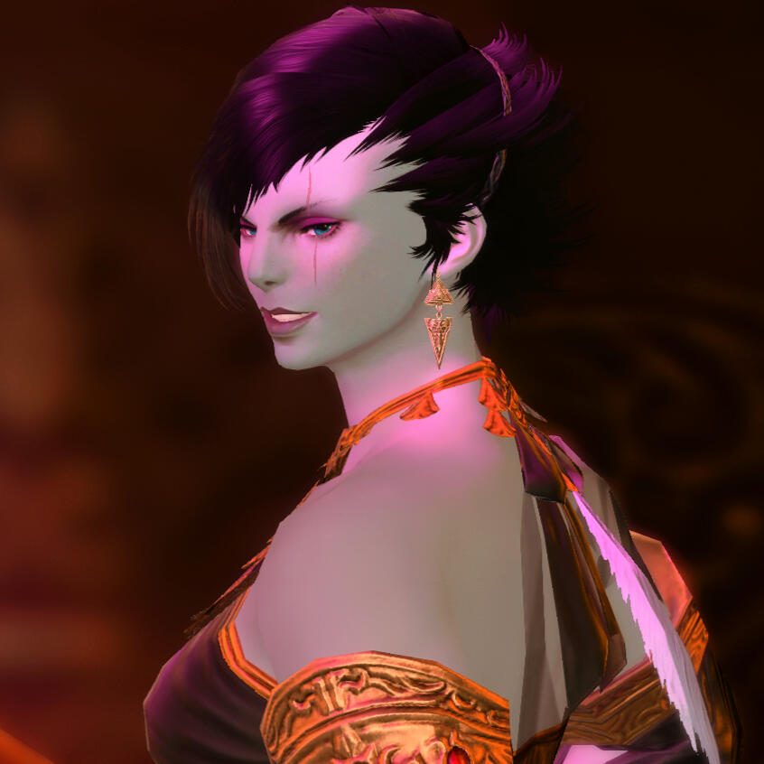 Glittering, glamorous, and genial, Ahtzarael works as a bartender at the Black Diamond. She is messy and excitable, with passable mixology skills largely supplemented by pure enthusiasm. When not behind the bar, she works to perfect her expertise as a safecracker, and prides herself on her ability to foil many supposedly impassable doors and vaults. She also enjoys tinkering, especially with the small, meticulous sort of work found in tinier devices and chronometers, and she handles repairs of such machines at a jewelry store in Ul'dah, the Golden Goddess Gemworks.More About Ahtzarael: ahtz.carrd.co